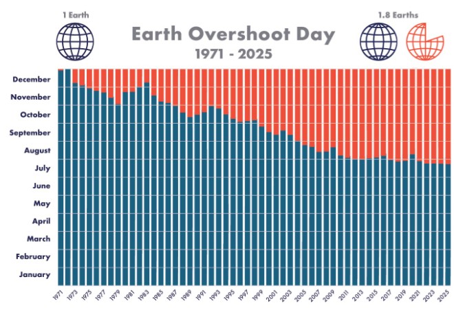 The trajectory is clear: over the past five decades, Earth Overshoot Day has moved up by over five months, from late December in 1971 to late July in 2025. We are now using the resources of 1.8 Earths each year.
