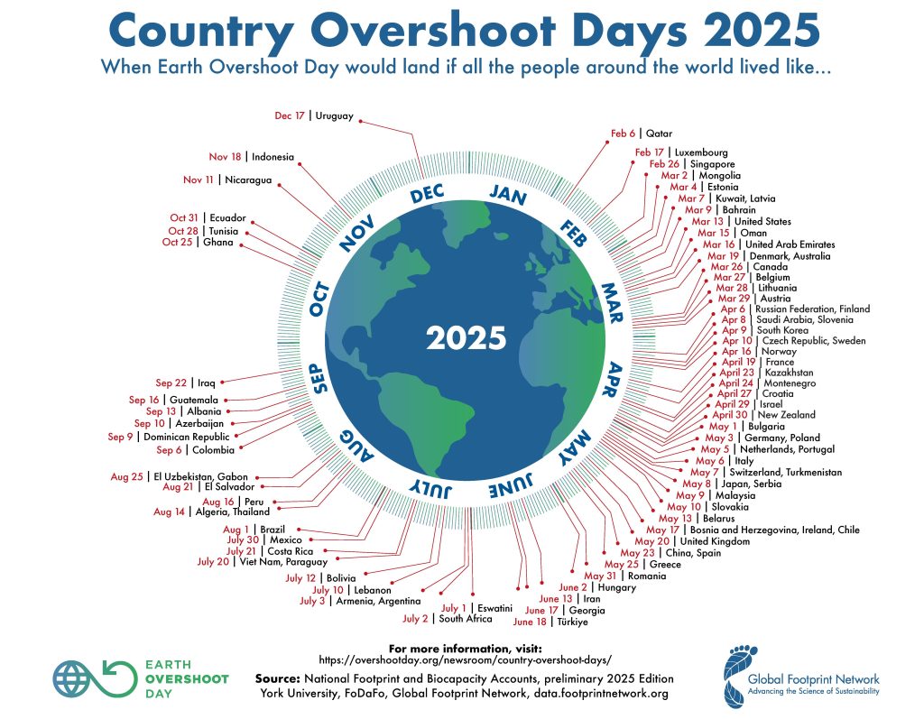 The earlier Earth Overshoot Day falls, the greater the ecological overshoot. In 2025, it signals that humanity is depleting forests, degrading soil, overfishing oceans, and emitting carbon far faster than the Earth can regenerate or absorb. The result: biodiversity loss, climate change, resource scarcity, and ecosystem collapse, all of which carry social, economic, and humanitarian consequences.
