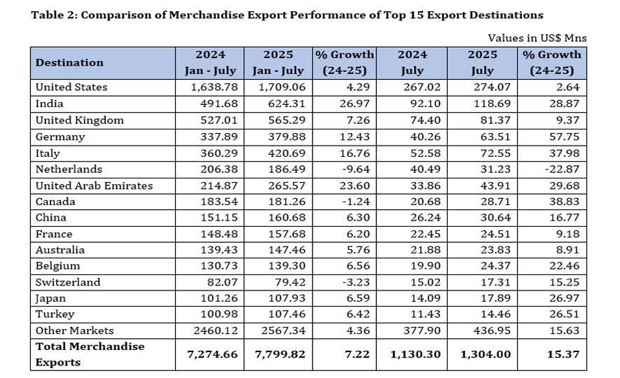In the opening seven months of 2025, Sri Lanka’s export sector demonstrated notable strength and adaptability. According to data from the Export Development Board (EDB), total exports (merchandise plus services) reached US$ 9.99 billion, marking a 7.79% increase over the same period in 2024. The impressive momentum continued in July, with export earnings for goods and services totaling US$ 1.64 billion, a 12.68% year-on-year rise.